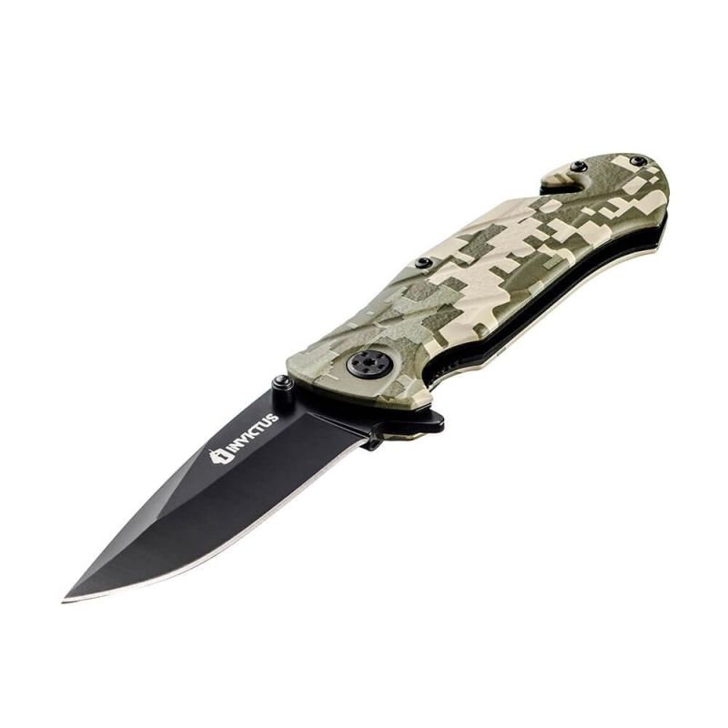O canivete Squad compõe o portfólio de canivetes táticos INVICTUS. Possui como diferenciais, além da lâmina em aço inoxidável 420, de maior resistência a impactos e maior durabilidade, cabo em óxido de alumínio com camuflado digital, clip tático, pomo metálico (quebra vidro), corta cinto no cabo e abertura fácil e rápida assistida por mola (spring assisted).