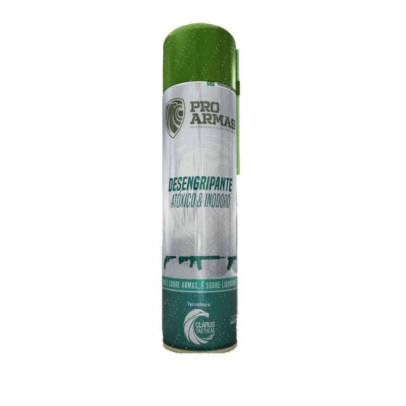 Desengripante Atóxico e Inodoro – ProArmas By CLARUS Tactical: produto totalmente inodoro: não deixa cheiro algum. Ideal para limpeza cotidiana de armas dentro de casa. Desengripa, limpa, solta partes emperradas e repele umidade. Atóxico (atende NR-15). Biodegradável. Compatível com materiais em geral. Substituto de desengripantes tóxicos. Dissolve resíduos de pólvora, cobre, chumbo, latão e zinco. Não atrai poeira e não deixa resíduos pegajosos