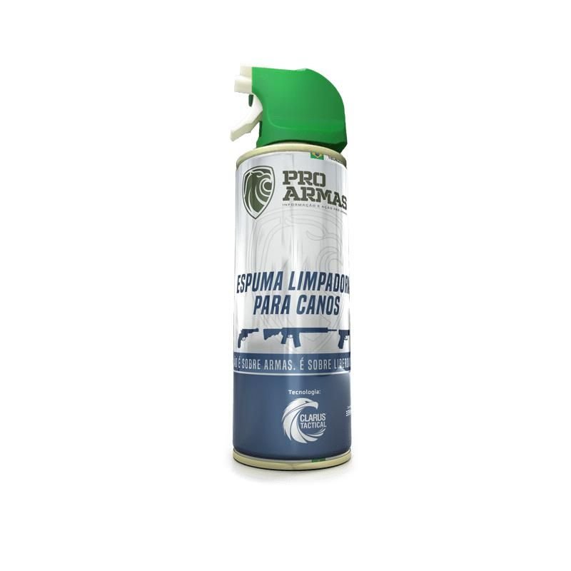 Espuma Limpadora para Canos ProArmas By CLARUS Tactical, ideal para limpeza de canos e partes metálicas com máxima praticidade e eficiência. Dissolve e remove rapidamente resíduos de pólvora.
