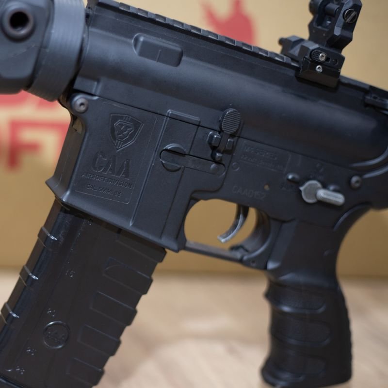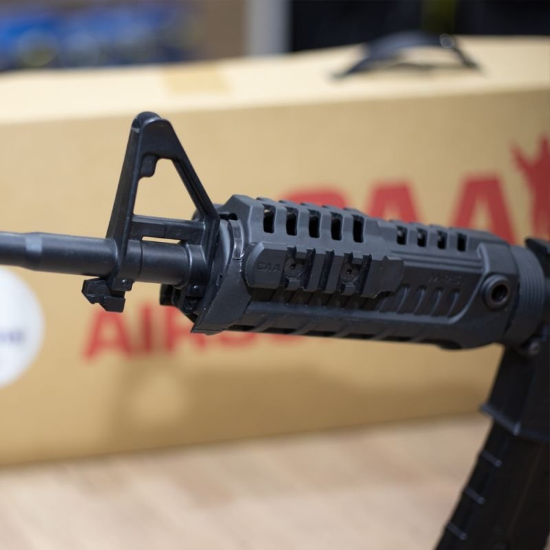 O rifle de airsoft do M4A1 CAA Custom, equipamento produzido pela CAA, com funcionamento elétrico e feito com polímero reforçado em fibra de nylon de alta resistência.
